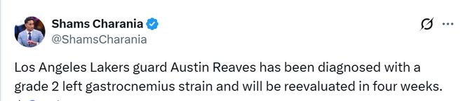 - Shams:湖人后卫里夫斯左腿腓肠肌二级拉伤,将在四周后复查