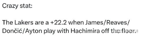 与此同时媒体发了一组数据,那就是当八村塁不在场,湖人只有另外四名先发,也就是詹姆斯、东契奇、里夫斯和艾顿搭档,无论剩下一名球员是谁,湖人可以净胜对手22分,媒体的意思很简单,至少目前这套阵容,前锋八村塁或许该去替补。