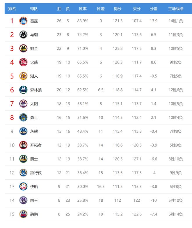 马刺输球后23胜8负,继续排名西部第二,落后第一的雷霆3个胜场,领先第三的掘金1个胜场。