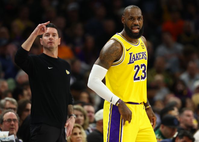 在NBA的江湖里,主教练公开点名球队的领袖,本就是极其罕见的操作。这绝非雷迪克一时冲动的言论,若没有湖人管理层在背后默许甚至支持,这位执掌湖人教鞭2年的少帅,断不敢将矛头直指联盟的 “历史第一人”。雷迪克的这番表态,更像是一场精心策划的 “背刺”,他的身份早已超越主教练,成为了湖人管理层的 “嘴替”,而摆在41岁詹姆斯面前的路,也被清晰地切割成两条。