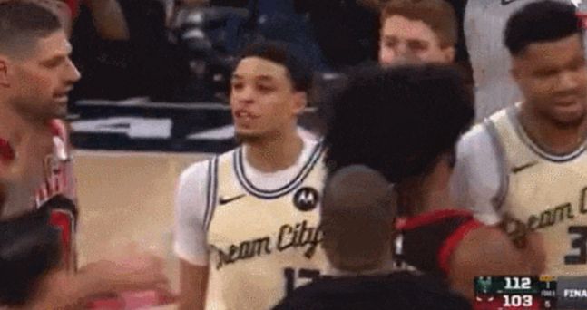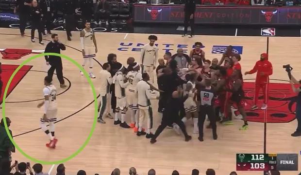 然后能看到作为当事人的希腊怪兽,在雄鹿队友为他出头时,自己却走出了包围圈。