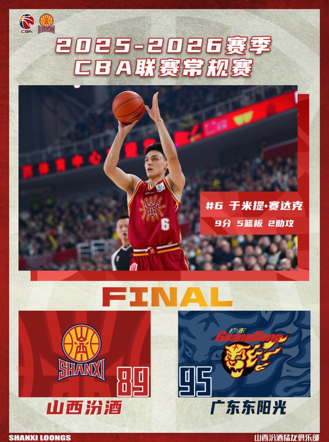北京时间2025年12月28日19:35,2025-2026赛季CBA联赛第七轮继续进行,山西汾酒主场迎战广东东阳光。两队历史上共交手48次,山西汾酒10胜38负,上赛季常规赛两队交手7次,山西汾酒6胜1负。本场比赛,山西队整体发挥欠佳,全队未能保持良好的心态,进攻端处理球过于急躁,命中率偏低,出现较多失误,末节全队奋力拼搏一度将比分迫近,但最终未能把握住机会,遗憾落败,最终全场比赛结束,山西汾酒89:95不敌广东东阳光。