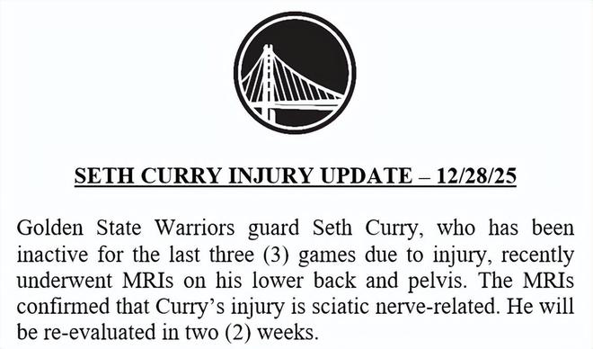 北京时间12月29日,金州勇士队官方宣布,后卫塞斯-库里因伤缺席了过去3场比赛,他近期对下背部和骨盆进行了核磁共振检查。检查结果确认,库里的伤病与坐骨神经有关。他将在两周后接受重新评估。