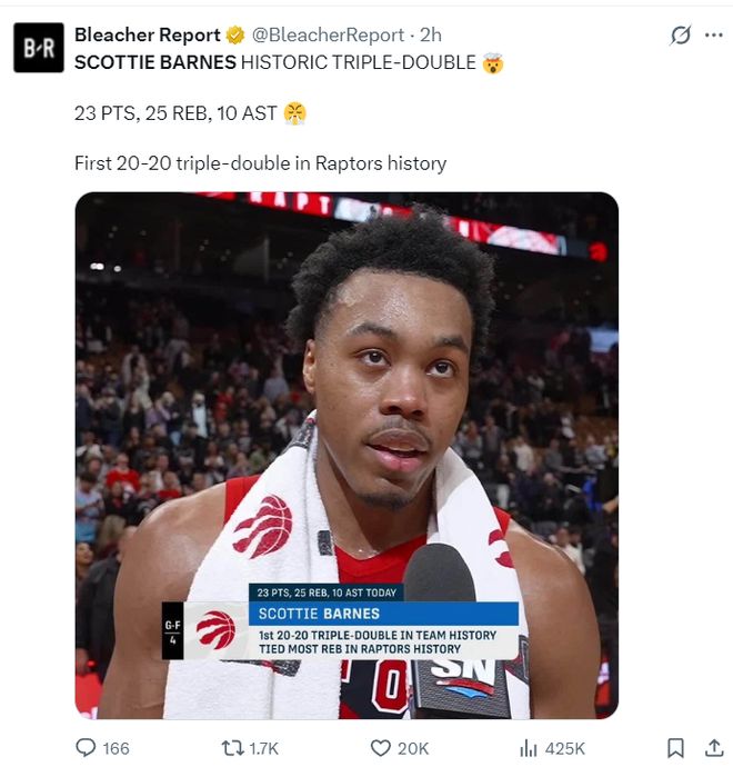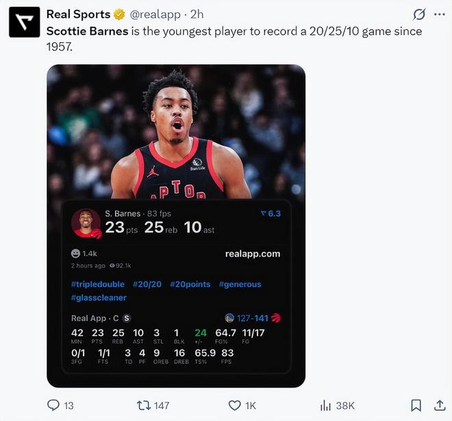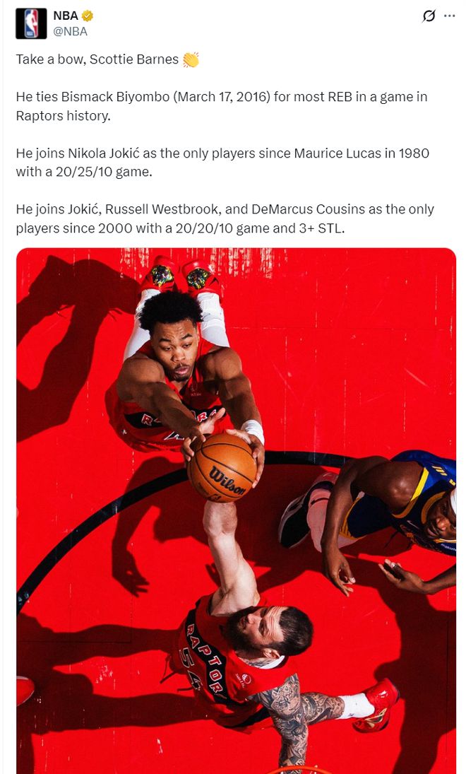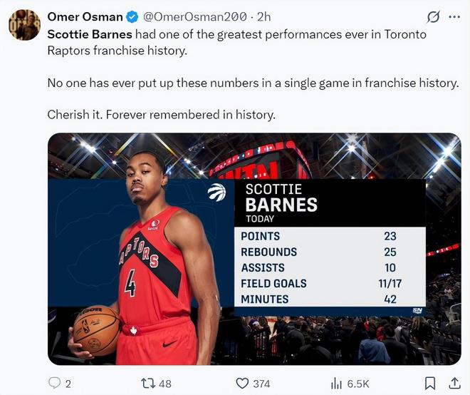 猛龙记者Omer Osman写道:巴恩斯打出了猛龙队史最出色的表现之一,这是一场载入史册的比赛,让人们铭记它吧。