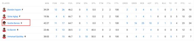 全场比赛巴恩斯42分钟,17中11,拿到23分25篮板10助攻3抢断1盖帽,命中率64.7%,他打出了一场狂暴的数据表现。