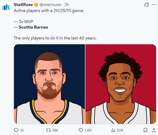 7.过去40年只有约基奇、巴恩斯打出过单场20+25+10;