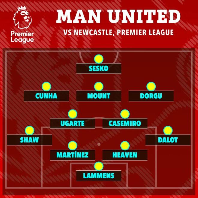 这是阿莫林执教13个月以来首次采用首发的4231阵型,卢克·肖回到左边卫位置,而帕特里克·多古则重演在意甲莱切时打右边锋的一幕,与迪奥古·达洛一起充实右侧防守。库尼亚和梅森·芒特替代受伤的布鲁诺·费尔南德斯,负责组织进攻。