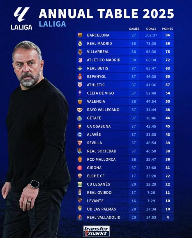 北京时间12月28日,德转统计出了2025年西甲联赛的积分榜,巴塞罗那以96分高居第一,皇家马德里86分第二,比利亚雷亚尔75分第三,马德里竞技72分排名第四。