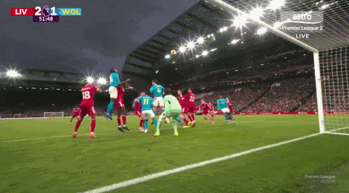 77分钟,利物浦反击丢球后前场有4名进攻球员无法及时回防,狼队利用这个机会快速反击,在禁区前从容拿球、分球,边路传中后头球攻门。
